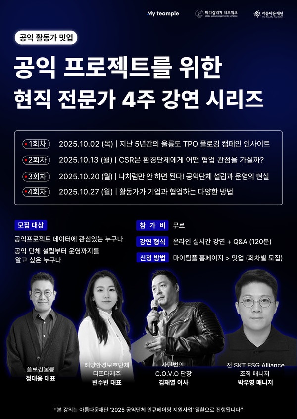 Çà»ç´Â °øÀÍ´Üü Ȱµ¿¿¡ °ü½É ÀÖ´Â ´©±¸³ª ¹«·á·Î Âü¿© °¡´ÉÇÏ´Ù. Âü°¡ÀÚµéÀº ÇöÀå °æÇèÀ» °¡Áø Ȱµ¿°¡¿Í ±â¾÷ ½Ç¹«ÀÚµéÀÇ °¿¬À» ÅëÇØ °øÀÍ ÇÁ·ÎÁ§Æ®ÀÇ ¼³°è, Á¶Á÷ ¿î¿µ, ±â¾÷ Çù·Â ¹æ¾È µî ½Ç¹«¿¡ Áï½Ã Ȱ¿ëÇÒ ¼ö ÀÖ´Â Áö½ÄÀ» ¾òÀ» ¼ö ÀÖ´Ù. Âü°¡ ½ÅûÀº û³â Á÷¹«±³À° Ç÷§Æû ¸¶ÀÌÆÀÇÃ(myteample.com) ȨÆäÀÌÁö¿¡¼ °¡´ÉÇϸç, Âü°¡ºñ´Â ¹«·á´Ù.