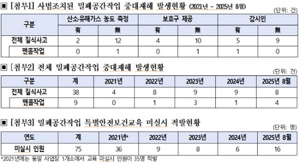 ¾È ÀÇ¿øÀº ÀÌ·¯ÇÑ ±âº» ¾ÈÀüÁ¶Ä¡ ¹ÌºñÀÇ ¹è°æÀ¸·Î ‘Ưº°¾ÈÀüº¸°Ç±³À°’ÀÇ ºÎ½ÇÀ» ÁöÀûÇß´Ù. ÃÖ±Ù 5³â°£ ¹ÐÆó°ø°£ÀÛ¾÷ °ü·Ã Ưº°±³À°À» ¹ÞÁö ¾ÊÀº ÀοøÀº ÃÑ 75¸í¿¡ ´ÞÇßÀ¸¸ç, ¹Ì½Ç½Ã ÀοøÀº 2022³â 9¸í¿¡¼ 2025³â 16¸íÀ¸·Î µÎ ¹è °¡±îÀÌ Áõ°¡Çß´Ù. ±×·¯³ª ÇöÇà »ê¾÷¾ÈÀüº¸°Ç¹ý¿¡´Â Ưº°±³À° ½ÇÀûÀ» Á¤ºÎ¿¡ º¸°íÇϵµ·Ï ÇÏ´Â ÀýÂ÷°¡ ¾ø¾î, °í¿ë³ëµ¿ºÎÁ¶Â÷ ±³À° ÀÌÇà ½ÇŸ¦ Á¦´ë·Î ÆÄ¾ÇÇÏÁö ¸øÇÏ´Â ½ÇÁ¤ÀÌ´Ù.