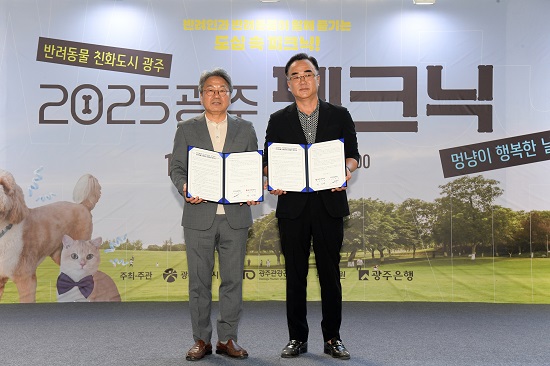 ¡ã °±âÁ¤ ±¤ÁÖ±¤¿ª½ÃÀå(»çÁø ¿ÞÂÊ)ÀÌ ±è´ëÁßÄÁº¥¼Ç¼¾ÅÍ ¾ß¿Ü±¤Àå¿¡¼ ¿¸° 2025 ±¤ÁÖ ÆêÅ©´Ð Çà»ç¿¡ Âü¼®ÇØ ÁøÁø¿µ ¢ßÇÏ´ÃÁ¤¿ø µ¿¹°À幦¾÷ ´ëÇ¥¿Í '¹Ý·Áµ¿¹° Àå·Ê¹®È »ó»ý¹ßÀü Çù¾à'À» ü°áÇÑ ÈÄ ±â³äÃÔ¿µÀ» Çϰí ÀÖ´Ù. (»çÁøÁ¦°ø=±¤ÁÖ±¤¿ª½Ã) |