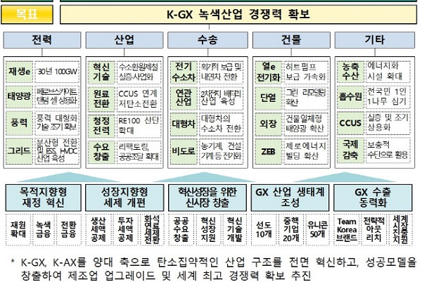 Á¤ºÎ´Â ‘2035 ±¹°¡ ¿Â½Ç°¡½º °¨Ãà¸ñÇ¥’ ¼ö¸³ÀÇ ÈÄ¼Ó Á¶Ä¡·Î ž籤, dz·Â, Àü·Â¸Á, ¿¡³ÊÁöÀúÀåÀåÄ¡(ESS), Àü±âÂ÷, ¹èÅ͸®, È÷Æ®ÆßÇÁ µî ³ì»ö»ê¾÷ À°¼ºÀ» À§ÇÑ ¼¼ºÎ ÃßÁø°úÁ¦¸¦ ´ãÀº ‘´ëÇѹα¹ ³ì»öÀüȯ(K-GX, Green Transformation)’À» °ü°èºÎó, »ê¾÷°è µî°ú ÇÔ²² ³»³â »ó¹Ý±â±îÁö ¼ö¸³ÇÒ ¿¹Á¤ÀÌ´Ù.