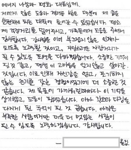 | ¡ã ¿¡³ÊÁö³ª´®°úÆòȷκÎÅÍ ÀåÇбÝÀ» Áö¿ø¹ÞÀº ÇлýÀÇ °¨»çÆíÁö | ||