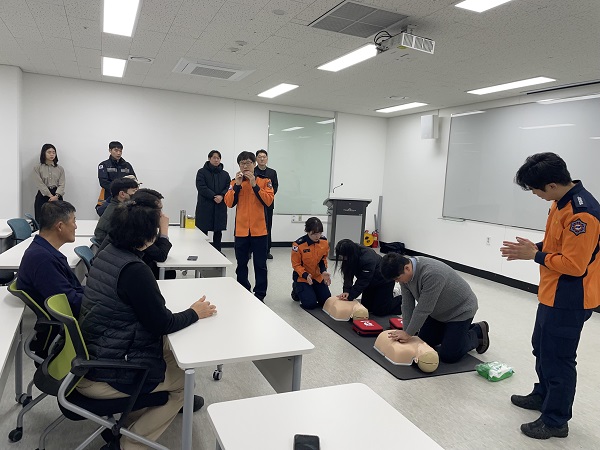 À̹ø °áÀǹ®¿¡´Â ¡ã¹Î·°ü Çù·Â ¼Ò¹æÀåºñ °øÀ¯Ç÷§Æû ±¸Ãà ¡ãÈÆ·ÃÀ» ÅëÇÑ ¼Ò¹æ·¾ÈÀüü°è È®¸³ ¡ãÁö¿ª»çȸ ¾ÈÀü È®º¸ µîÀÇ ³»¿ëÀÌ ´ã°åÀ¸¸ç, À̳¯ Çà»ç¿¡´Â ½Å¼¼°è»çÀÌ¸Õ ÆÄÁÖ ÇÁ¸®¹Ì¾ö¾Æ¿ï·¿ ¼ÛÁ¤¹Î ¿î¿µÁö¿øÆÀÀåÀ» ºñ·ÔÇÑ ÀÓÁ÷¿ø 25¸íÀÌ Âü¼®ÇØ ÈÀç ¿¹¹æ ±³À°°ú ÇÔ²² ÀÚµ¿Á¦¼¼µ¿±â(AED)¸¦ Ȱ¿ëÇÑ ½ÉÆó¼Ò»ý¼ú(CPR) ±³À°µµ ÇÔ²² ÁøÇàµÆ´Ù.