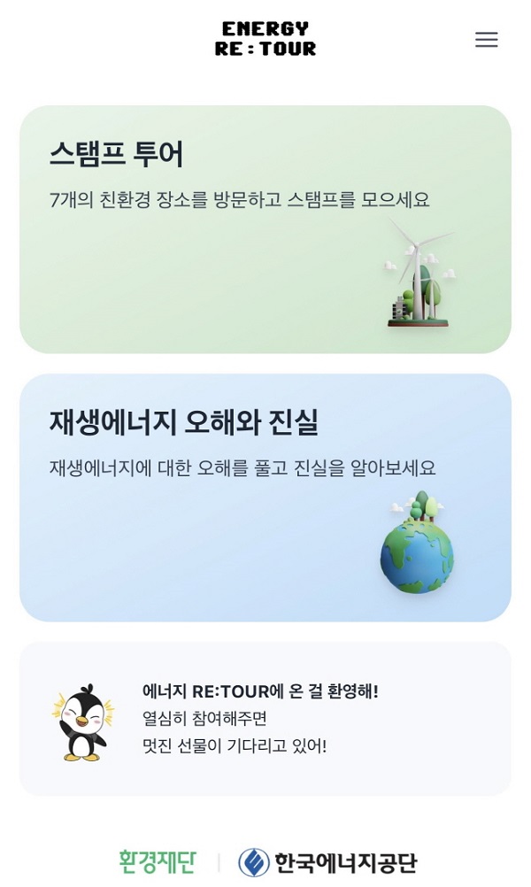 À̹ø Ä·ÆäÀÎÀº NFC ۸µÀ» Ȱ¿ëÇØ ½Ã¹ÎµéÀÌ Àü±¹ Àç»ý¿¡³ÊÁö °ÅÁ¡À» ¹æÇϰí ÀÎÁõÇÏ´Â ½ºÅÆÇÁ Åõ¾î ¹æ½ÄÀ¸·Î ¿î¿µµÆ´Ù. ¿Â¶óÀο¡¼´Â Àç»ý¿¡³ÊÁö¿¡ ´ëÇÑ ÀÌÇØ¸¦ ³ôÀ̱â À§ÇÑ ÄûÁ ºñ·ÔÇØ, ¾î¸°À̵éÀÌ Àç»ý¿¡³ÊÁö¸¦ º¸´Ù ½±°í Àç¹ÌÀÖ°Ô ÀÌÇØÇÒ ¼ö ÀÖµµ·Ï Àαâ ŰÁî À¯Æ©¹ö ‘Àνΰ¡Á·’°ú Çù¾÷ÇÑ ÄÜÅÙÃ÷¸¦ ¼±º¸¿´´Ù.