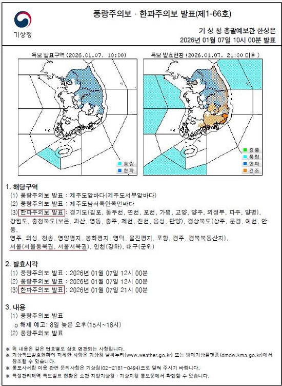 ÇÑÆÄÆ¯º¸ Áß ‘ÇÑÆÄÁÖÀǺ¸’´Â ¾ÆÄ§ ÃÖÀú±â¿ÂÀÌ Àü³¯º¸´Ù 10¡É ÀÌ»ó ÇϰÇÏ¿© 3¡É ÀÌÇÏÀÌ¸é¼ Æò³â°ªº¸´Ù 3¡É ÀÌ»ó ³·À» °ÍÀ¸·Î ¿¹»óµÇ°Å³ª ¾ÆÄ§ ÃÖÀú±â¿ÂÀÌ Àü³¯º¸´Ù 12¡É ÀÌÇÏÀÎ ³¯ÀÌ 2ÀÏ ÀÌ»ó Áö¼ÓµÉ °ÍÀ¸·Î ¿¹»óµÉ ¶§ ¹ßÈ¿µÈ´Ù.