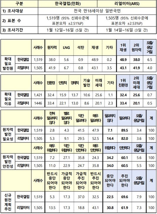 °¶·´ÀÇ Á¶»ç°á°ú, ÇâÈÄ È®´ë°¡ ÇÊ¿äÇÑ ¹ßÀü¿øÀº Àç»ý¿¡³ÊÁö 48.9%, ¿øÀÚ·Â 38.0%, ¾×Èõ¿¬°¡½º(LNG) 5.6% ¼øÀ¸·Î ³ªÅ¸³µÀ¸¸ç, ¿øÀÚ·Â ¹ßÀü Çʿ伺¿¡ ´ëÇØ¼´Â ‘ÇÊ¿äÇÏ´Ù’´Â ÀǰßÀÌ 89.5%, ‘ÇÊ¿äÇÏÁö ¾Ê´Ù’´Â ÀǰßÀÌ 7.1%·Î ³ªÅ¸³µ´Ù. ¿øÀÚ·Â ¹ßÀü ¾ÈÀü¼º¿¡ ´ëÇØ¼´Â ‘¾ÈÀüÇÏ´Ù’´Â ÀǰßÀÌ 60.1%, ‘À§ÇèÇÏ´Ù’´Â ÀǰßÀÌ 34.2%·Î ³ªÅ¸³µÀ¸¸ç, Á¦11Â÷ Àü±âº»¿¡ ¹Ý¿µµÈ ½Å±Ô¿øÀü °èȹÀÇ ÃßÁø ¿©ºÎÀÇ °æ¿ì, ‘ÃßÁøµÇ¾î¾ß ÇÑ´Ù’´Â ´äº¯ÀÌ 69.6% ‘ÁߴܵǾî¾ß ÇÑ´Ù’´Â ´äº¯ÀÌ 22.5%·Î ³ªÅ¸³µ´Ù.