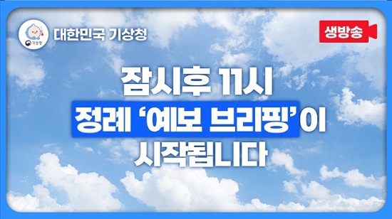 ´ë±¹¹Î‘¿¹º¸ ºê¸®ÇÎ’Àº Á¤·ÊÀûÀ¸·Î ¸ÅÁÖ ¸ñ¿äÀÏ ¿ÀÀü 11½Ã ±â»óû À¯Æ©ºê(´ëÇѹα¹ ±â»óû)¿¡¼ »ýÁß°èµÉ ¿¹Á¤ÀÌ´Ù. ¶ÇÇÑ, À§Çè±â»óÀÌ ¿¹»óµÉ ¶§´Â ¼ö½Ã ‘¿¹º¸ ºê¸®ÇÎ’µµ Ãß°¡·Î ÁøÇàµÈ´Ù.