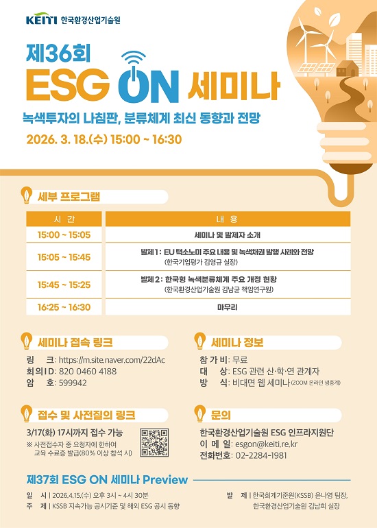 Çѱ¹È¯°æ»ê¾÷±â¼ú¿øÀº ‘³ì»öÅõÀÚÀÇ ³ªÄ§ÆÇ, ºÐ·ùü°è Ãֽе¿Çâ°ú Àü¸Á’À» ÁÖÁ¦·Î 3¿ù 18ÀÏ ¿ÀÈÄ 3½Ã ‘Á¦36ȸ ÀÌ¿¡½ºÁö(ESG) ¿Â(ON) ¼¼¹Ì³ª’¸¦ ¿Â¶óÀÎÀ¸·Î °³ÃÖÇÑ´Ù.