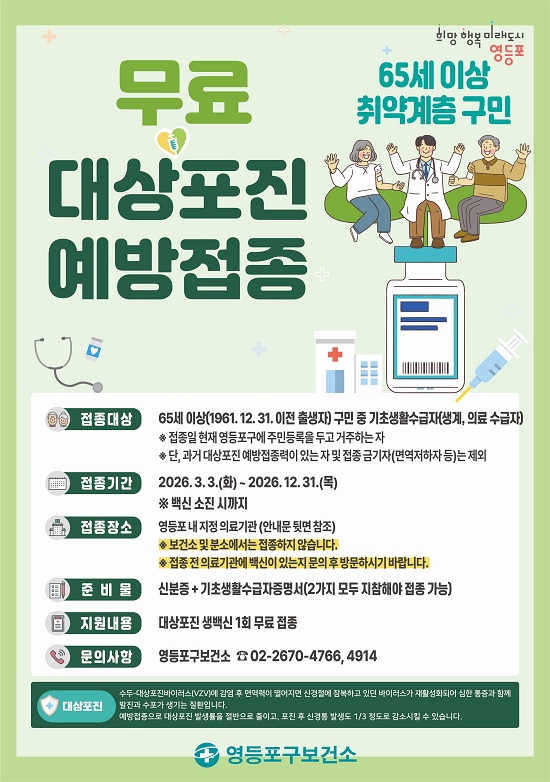 ¿µµîÆ÷±¸°¡ 65¼¼ ÀÌ»ó Ãë¾à°èÃþ ¾î¸£½ÅÀ» ´ë»óÀ¸·Î ´ë»óÆ÷Áø ¹«·á ¿¹¹æÁ¢Á¾À» Áö¿øÇØ °æÁ¦Àû ºÎ´ãÀ» ´ú°í ¸é¿ª·Â °È¿¡ ³ª¼±´Ù.