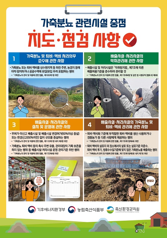 ÁÖ¿ä Á¡°Ë Ç׸ñÀº °¡ÃàºÐ´¢Ã³¸®½Ã¼³ ¼³Ä¡ ±âÁØ, Á¤È½Ã¼³ ¹æ·ù¼ö¼öÁú±âÁØ, ¾×ºñ »ìÆ÷±âÁØ, ¹èÃâ½Ã¼³ ¹× 󸮽ü³ °ü¸®±âÁØ, °¡ÃàºÐ´¢ ÀûÁ¤ °ü¸® ¹× Åðºñ¾×ºñȱâÁØ Áؼö ¿©ºÎ µîÀ̸ç, ¡â°¡ÃàºÐ´¢ ¶Ç´Â Åðºñ·¾×ºñÀÇ ÇÏõ ÁÖº¯ ¶Ç´Â ³ó°æÁö µî¿¡ ¾ßÀû ¹æÄ¡Çϰųª °ø°ø¼ö¿ª À¯ÀÔ, ¡â ¹«Çã°¡·¹Ì½Å°í °¡ÃàºÐ´¢ ¹èÃâ·Ã³¸®½Ã¼³ ¿î¿µ, ¡â°ü¸®ÀÏÁö·´ëÀåÀÇ ¹ÌÀÛ¼º ¶Ç´Â ¹Ìº¸°ü, ¡â°¡ÃàºÐ´¢ ÀçȰ¿ë ¹Ì½Å°í ¶Ç´Â °ü·Ã ¹«Çã°¡ ¿µ¾÷, ¡â¾×ºñ »ìÆ÷±âÁØ ¹ÌÁؼö µîÀ» ÇöÀå¿¡¼ È®ÀÎÇÒ °èȹÀÌ´Ù.