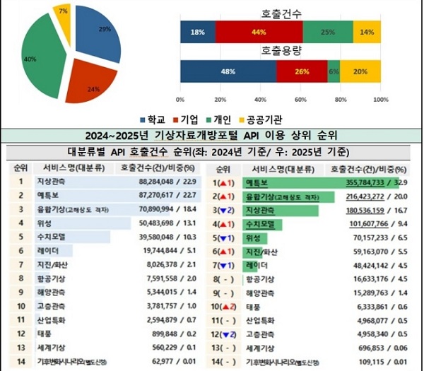 ÀÚÁÖ ÀÌ¿ëÇÏ´Â ±â»óÁ¤º¸´Â '¿¹º¸‧Ưº¸'(33%), '°íÇØ»óµµ °ÝÀںм®'(20%), 'Áö»ó°üÃø'(17%), '¼öÄ¡¸ðµ¨'(9%), 'À§¼º'(7%) ¼øÀ¸·Î ³ªÅ¸³µ´Ù. ±â»óû Á¦°ø ÀÚ·á Áß ´Ü±â¿¹º¸´Â °ø°øµ¥ÀÌÅÍÆ÷Åп¡¼ °¡Àå ¸¹ÀÌ È°¿ëÇÏ´Â 2À§¿¡ ¿À¸¦ ¸¸Å ³Î¸® »ç¿ëµÇ°í ÀÖ´Ù. ¶ÇÇÑ ±â»óÀÚ·á°³¹æÆ÷ÅÐÀ» ÅëÇÑ °ÝÀںм®ÀÚ·á ÀÌ¿ë °Ç¼ö´Â '24³â 7õ¸¸ °Ç¿¡¼ '25³â 2¾ï 2õ¸¸ °ÇÀ¸·Î 3¹è ÀÌ»ó ´Ã¾ú´Ù.