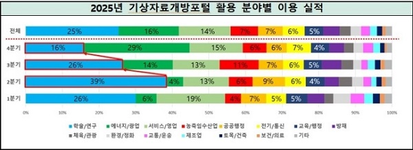±â»óÁ¤º¸ Ȱ¿ë ºÐ¾ß´Â 'Çмú‧¿¬±¸'(25%) ºÐ¾ß°¡ °¡Àå ³ôÀº ºñÁßÀ» Â÷ÁöÇÏ´Â °¡¿îµ¥, '¿¡³ÊÁö'¿Í 'Àç³´ëÀÀ' ºÐ¾ßÀÇ ÀÌ¿ëÀÌ Å©°Ô ´Ã¾î '24³â ´ëºñ °¢°¢ 7.3¹è, 3.0¹è Áõ°¡Çß´Ù.