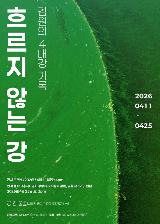 Àç´Ü¹ýÀÎ ½£°ú³ª´®(ÀÌ»çÀå ÀåÀ翬)Àº ⟪È帣Áö ¾Ê´Â °: ±è¿øÀÇ 4´ë° ±â·Ï⟫À» <°ø°£Ç®½£>¿¡¼ 4¿ù 11ÀÏ(Åä)ºÎÅÍ 4¿ù 25ÀϱîÁö °³ÃÖÇÑ´Ù. ÀÌ Àü½Ã´Â ±è¿ø ÀÛ°¡°¡ 4´ë°(ÇѰ, ³«µ¿°, ±Ý°, ¿µ»ê°) °ø»ç ÇöÀåÀ» ¼ö³â°£ ÃÔ¿µÇÑ »çÁø 70¿© Á¡°ú 4´ë° »ç¾÷À» ¸ñµµÇÏ¸ç ½É°æÀ» ´ãÀº ÃÖ±Ù ÀÎÅÍºä ±×¸®°í ÀÛ°¡ÀÇ Àú¼¿Í ±â°í¹®µé·Î ±¸¼ºµÈ´Ù. ±è¿ø ÀÛ°¡´Â “°ÀÌ »ì¾ÆÀÖÀ½À» Áõ¸íÇϰí, µ¿½Ã¿¡ °ÀÌ Á׾´Â °úÁ¤À» ³²±â±â À§ÇØ »çÁøÀ» Âï¾ú´Ù”°í ¸»ÇÑ´Ù.